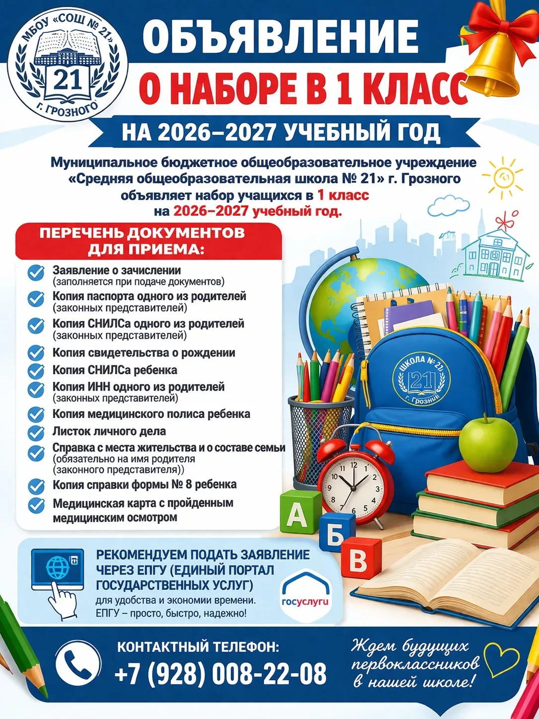 МБОУ «СОШ № 21» г. Грозного объявляет набор обучающихся в 1 класс на 2026–2027 учебный год. 📌 Перечень документов для приема:- Заявление о зачислении (заполняется при подаче документов) - Копия паспорта одного из родителей (законных ...