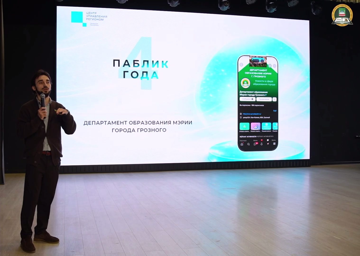 По итогам фестиваля госпаблик Департамента образования Мэрии города Грозного был удостоен звания «Паблик года» - лучшего государственного сообщества региона. Для Департамента это уже вторая подряд высокая оценка профессионального сообщества: в 2024 году паблик стал победителем в номинации «Информатор года». Награду в виде статуэтки и благодарственного письма получила помощник начальника Департамента Иман Темирсултанова.